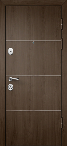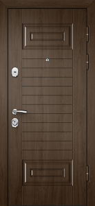 Древесные тона. Входная дверь темный дуб и входная дверь темный орех — универсальная классика под бежевые стены и тёплые полы. Дверь входная темный венге даёт максимальный контраст в светлом интерьере и хорошо поддерживается чернёной фурнитурой.